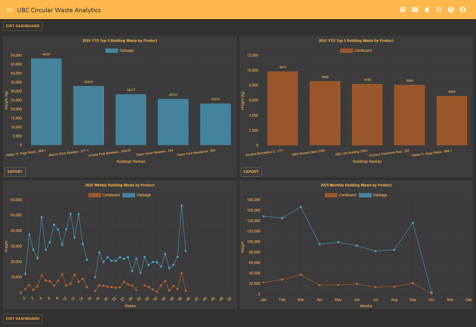 UBC’s Zero Waste Action Plan 2030 includes a target to reduce garbage disposal by 50% by 2030, relative to 2019.To support the achievement of this target, UBC Municipal Operations equipped their new garbage truck with a weigh scale to determine kilograms of dumpster waste (and corrugated cardboard) for each pickup. This data is attributed to each dumpster location based on RFID tags, and the system uses geolocation as a backup.The CWA integrates the truck scale data with other data sets including compactor data, and provides a range of analytics and charts tailored to the needs of two departments: Campus + Community Planning and Municipal Operations.